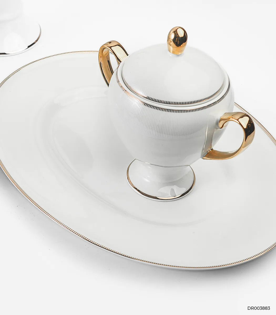 - شكل ذهبي فاخر : يتميز الطقم بحواف وتفاصيل مزخرفة باللون الذهبي البراق، المطبق بتقنية لضمان ثبات اللون ومقاومته مع الاستخدام والعناية المناسبة. يضيف هذا الديكور لمسة من العظمة والرقي.