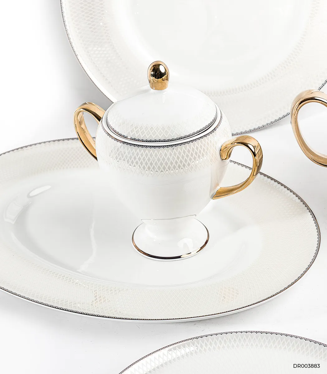- طقم متكامل (113 قطعة): يوفر تشكيلة واسعة من الأطباق والأدوات لتغطية جميع احتياجات الضيافة لـ 12 شخصًا وأكثر، بما في ذلك أطباق تقديم رئيسية وأطباق غرف ومجموعات شاي وقهوة.